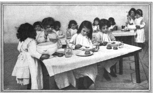 MONTESSORI CHILDREN EATING DINNER IN THE CLOISTERS OF THE SCHOOL HELD BY THE FRANCISCAN NUNS. PEPINELLA AND UMBERTINO, THREE AND ONE HALF AND FOUR YEARS OLD, ARE REMOVING THE SOUP-PLATES